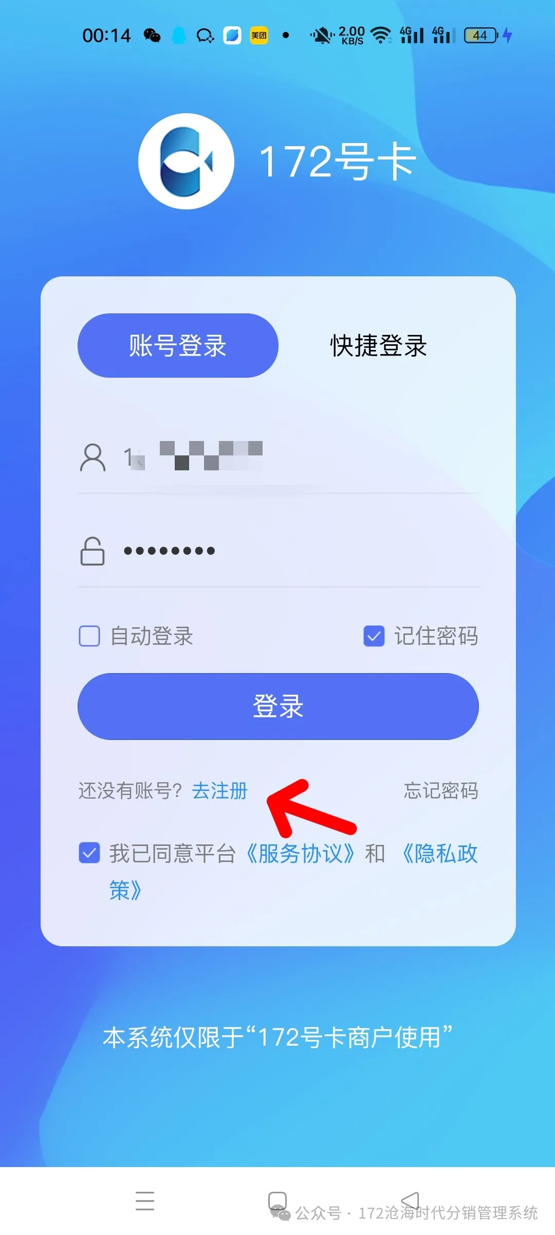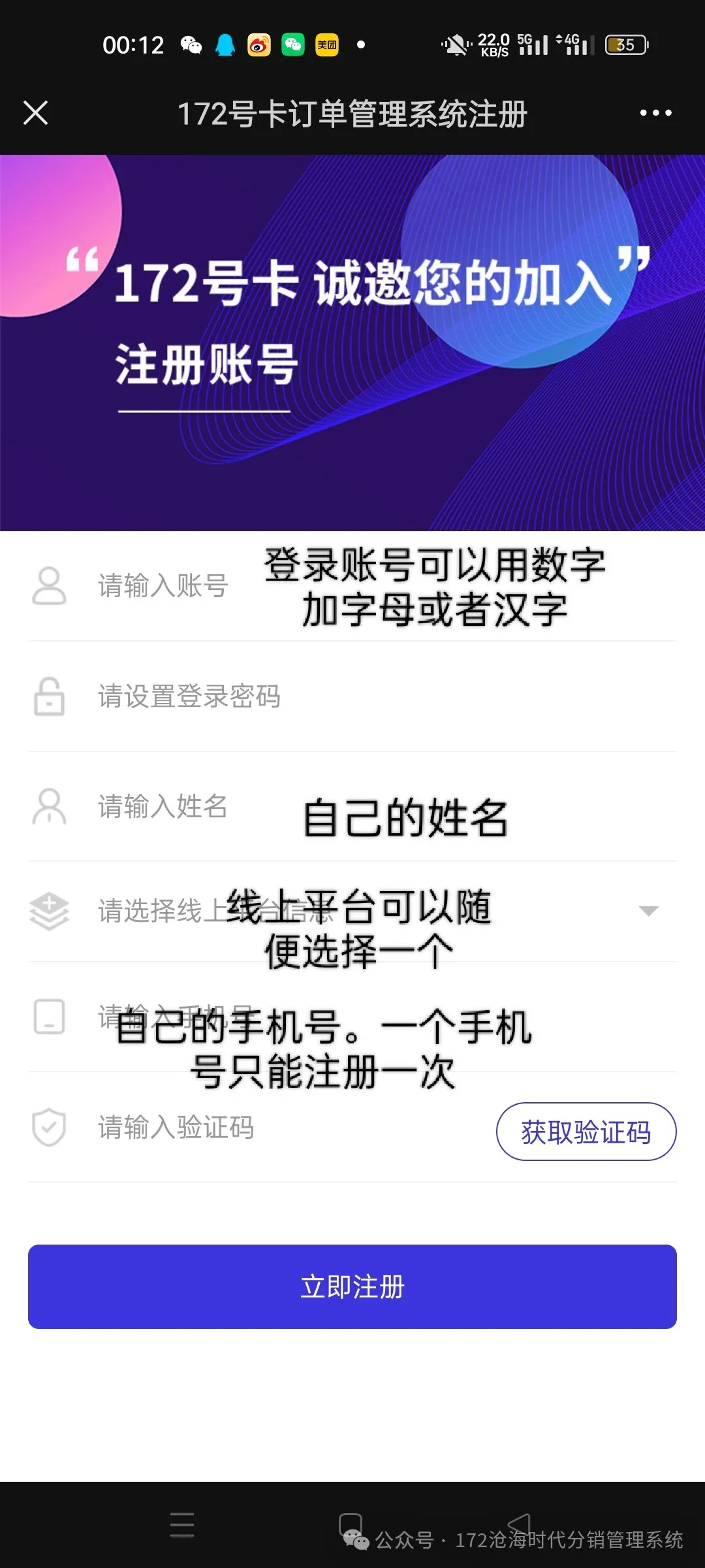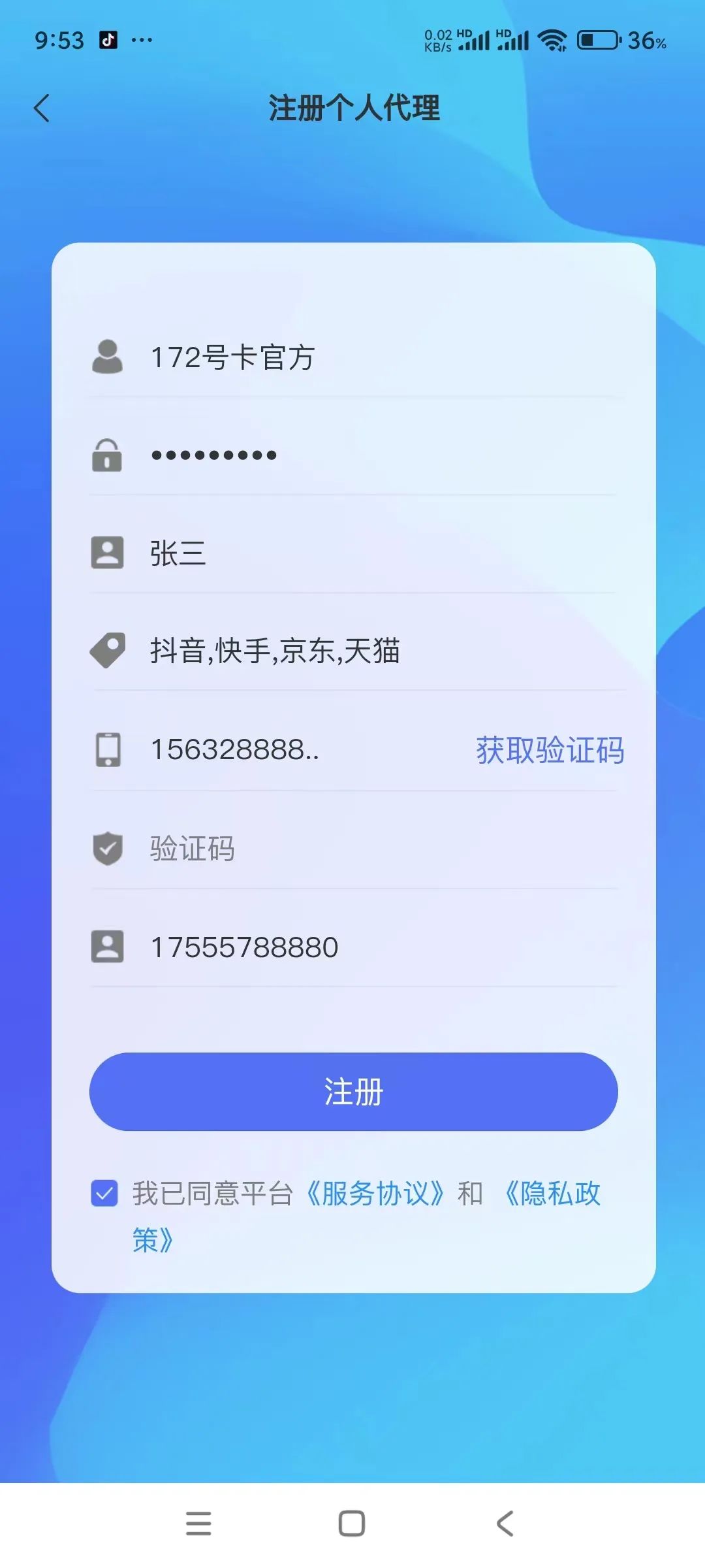 172号卡平台的注册流程分为两种:扫码注册,写推荐人手机号注册(注:是否能成为一级代理取决于你扫的谁的码或者写的谁的手机号)注册的时候擦亮眼睛