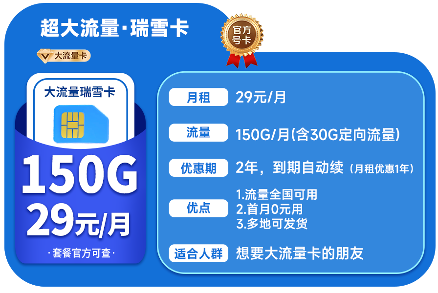 瑞雪卡套餐是29元150G,一张卡就能顶两张常规卡的总和,相当于直接省了一半的钱,一张卡用出两张流量卡效果。