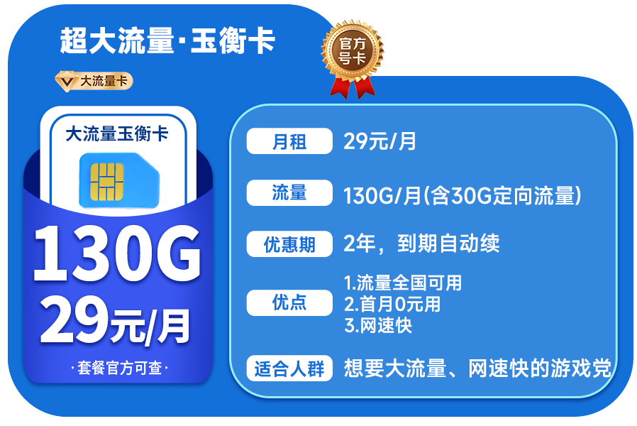 玉衡卡套餐是29元130G,大部分人正常刷刷视频,一个月差不多也是用一百G左右,办这张卡比常规卡29元80G好很多。